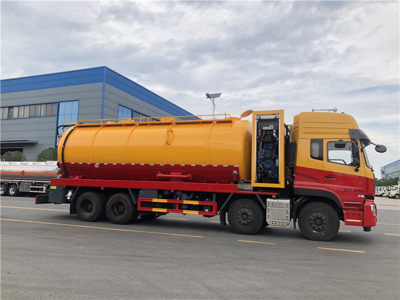 罐体容积为33方,配天津通洁350流量高压泵, 直径22高压管100米,一个9公斤水雷,一个800直柄喷头,液压卷盘,吸污部分采用潍柴420马力副发动机带淄博258水循环泵,2根8米吸污管带阴阳端快接头,水罐和污罐互通,用100球阀开关,罐体顶部加护栏平台(加宽)和爬梯,尾部加装一个600mm快开,尾部视污管,一个150排污球阀带出口盘,右边2个100吸污球阀带出口盘,污水罐底部加装一个150球阀的偷排口,罐体内铺1.2米不锈钢底板,罐内做两道防浪板,清水箱作业两边各做一个65消防接头,罐子顶部做2个直径600的水泥罐口,罐内带爬梯,水罐底部加装一个50排水球阀,箭头灯,进料管直径120,直径220的弯头(加厚)接长,后保险杠加固,耐震压力表。