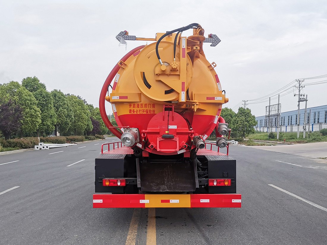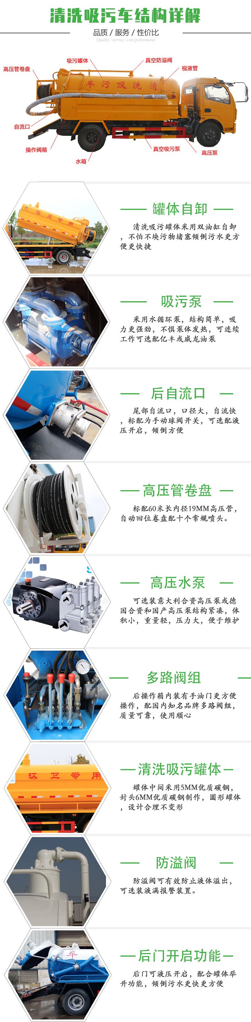 吸污部分:16方污罐,罐体8mmQ235优质碳钢,配潍柴420副发动机带淄博SK-42/258水循环泵,罐体内部平铺1.2米不锈钢底板,10米吸污管一根,进气管加过滤网,防溢阀加高,后盖卡扣锁紧,前视污量管,后尾部加装3个100mm的球阀吸污口,600mm排污口液压开启,150mm排污球阀,罐体带举升功能。