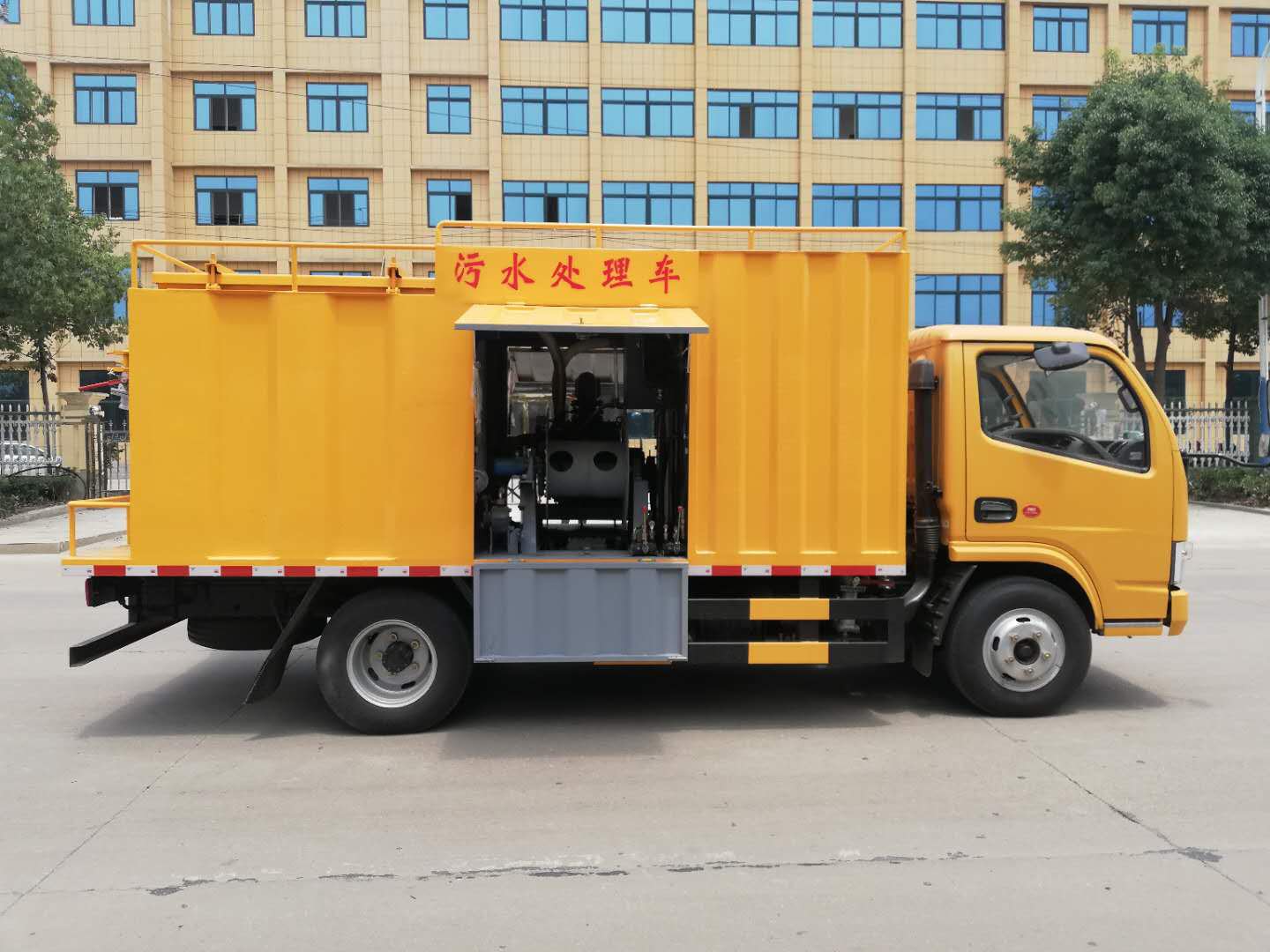 污水处理车主要用于化粪池的快速处理,是替代吸污吸粪车、清洗吸污车的一款全新车型。目前污水处理车可选东风多利卡3308mm(蓝牌)/3800mm轴距底盘,可满足客户不同需求。蓝牌污水处理车有3立方清水箱,3立方污水分离箱、黄牌的污水处理车有4立方清水箱,6立方污水分离箱。比清洗吸污车容积更大,且整车不超重。