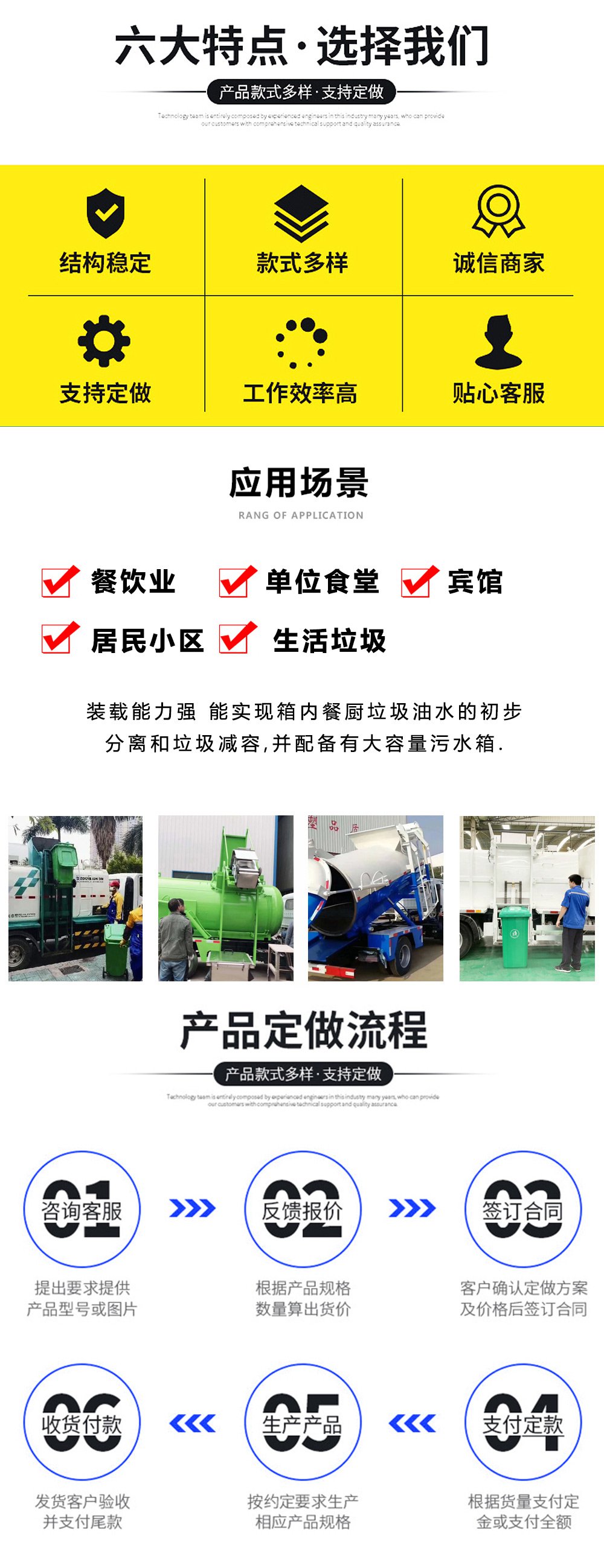 2、具有干湿分离功能 能实现箱内餐厨垃圾油水的初步分离和垃圾减容,并配备有大容量污水箱,装载能力强。