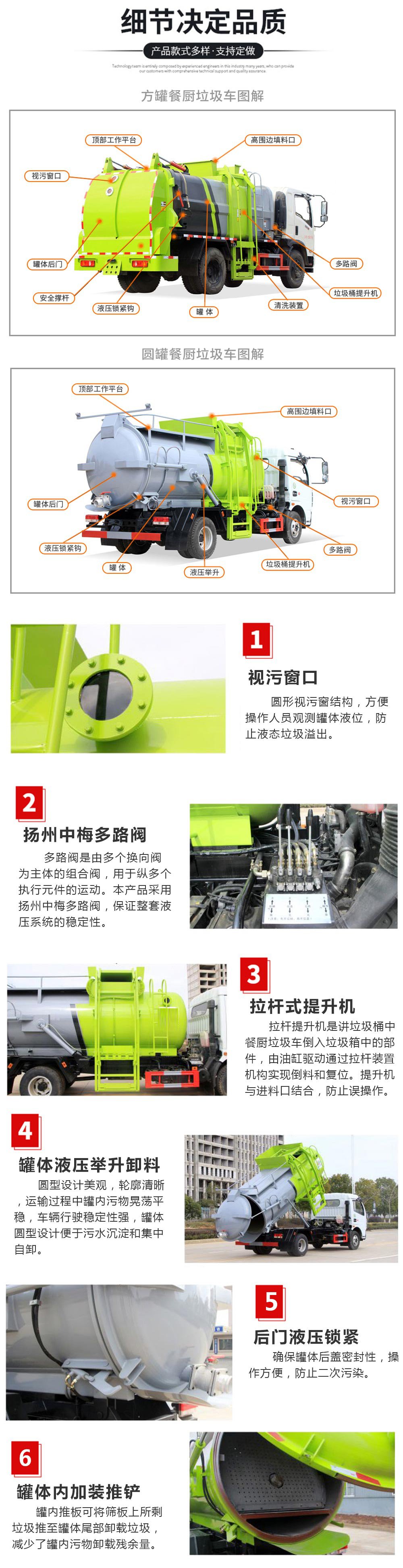 罐体采用优质碳钢板材,罐体内部选装带固液分离功能(全推推板,不锈钢泔水分离网板),选装罐内加热功能(用于严寒地带防止罐内餐饮垃圾冻结凝固,采用柴油燃烧机加热,加热速度快效果好,可设置高低温实现自动温控)。餐厨垃圾车带全液压操作系统,罐体举升自卸,拉杆式挂桶提升机,可以挂120/240升垃圾桶进行作业,后盖液压驱动开启、锁紧,方便人员操作。