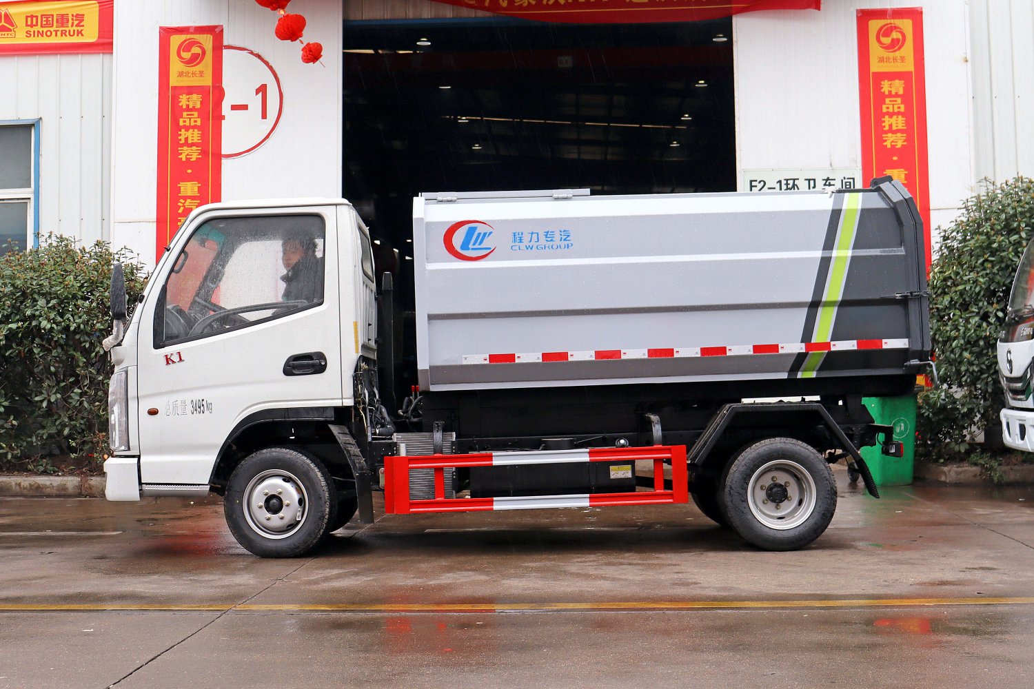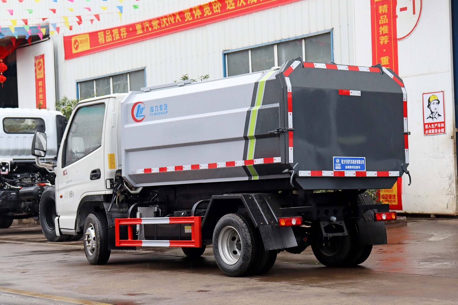侧装式压缩垃圾车属于自装卸式垃圾车的一种,采用侧提桶上料方式进行生活垃圾收集,采用推板推挤或自卸式进行卸料。主要结构:汽车底盘、垃圾厢体、底架、侧提桶机构、后门总成、推板总成、液压系统和电控系统。液压及电控系统由油泵、油缸、油箱、电液**阀、PLC和**开关等组成。同时本车自重轻,箱体为圆弧形,容积大,同等车型中装载量**,并且美观大方。