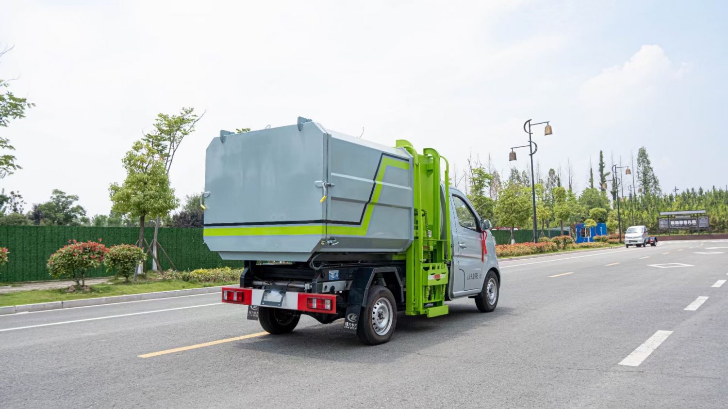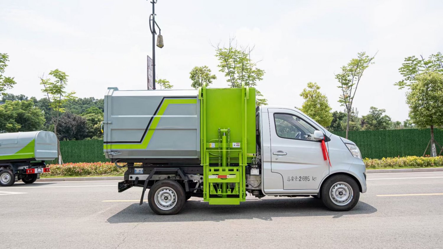 该车箱体有效容积3立方,箱体前部侧面带有挂桶提升机构,可自动举升垃圾桶倒入垃圾,带自卸功能,尾部装有橡胶密封条,防污水滴漏,杜绝二次污染。挂桶垃圾车可根据客户要求搭配120升或240升塑料桶和铁桶。