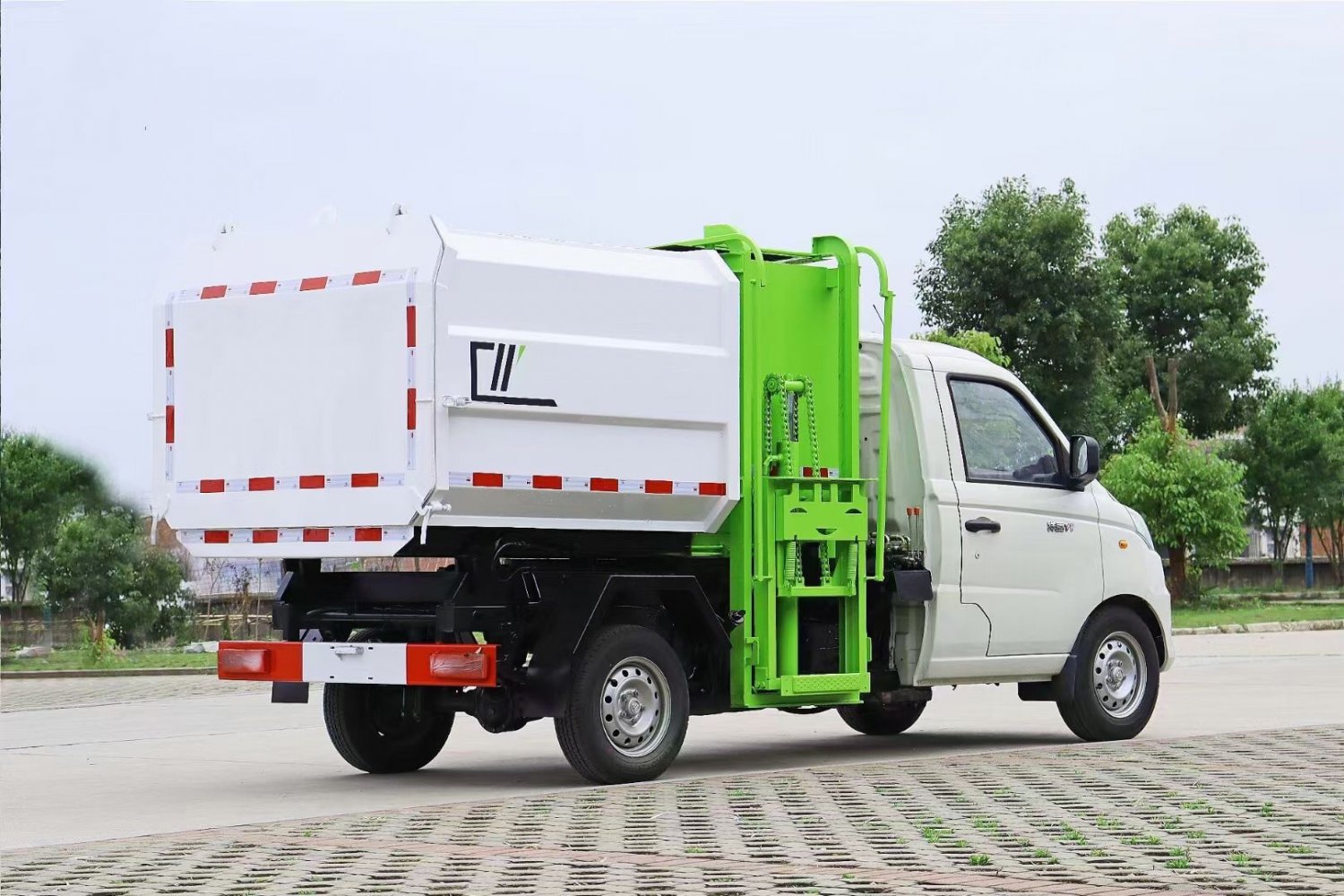 该车箱体容积约4立方,箱体前部侧面带有挂桶提升机构,可自动举升垃圾桶倒入垃圾,带自卸功能,尾部装有橡胶密封条,防污水滴漏,杜绝二次污染。挂桶垃圾车可根据客户要求搭配120升或240升塑料桶和铁桶。