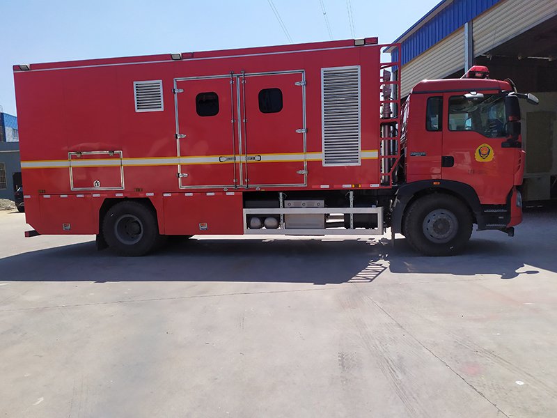 4) 安全措施。车厢内门口处配有消防灭火器, 车厢内配有烟感报**器、交直流防爆照明灯和应急灯, 还有方便使用的接地钎和接地线, 以有效保证电源车的安全。选用智能灭火系统,可无人值守。
